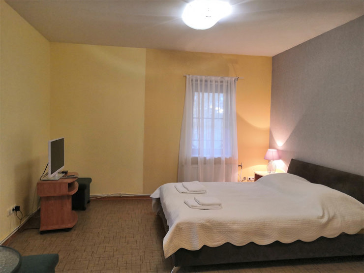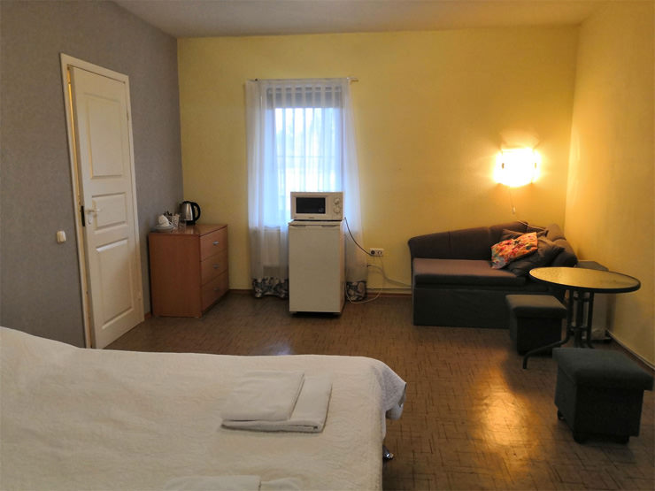 Площадь номера - 25 кв.м. 2 осн. места. 1 доп. место. Мебель: вешалка, диван, зеркало, кровать двуспальная, прикроватные тумбочки, стол, стулья, шкаф. Оборудование: микроволновая печь, мини-холодильник, телевизор, электрочайник. Санузел: с душем, туалетные принадлежности, фен. Сервис: Wi-Fi бесплатно, смена полотенец, смена постельного белья, уборка номера.